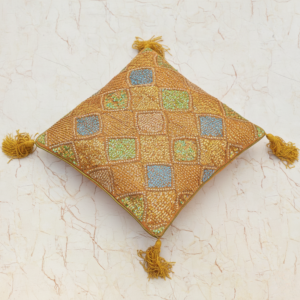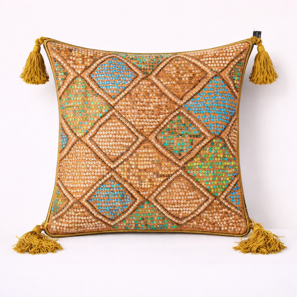 Bring warmth and vibrant elegance into your home décor with this handcrafted orange cushion cover, beautifully detailed with intricate diamond patchwork embroidery. The rich orange base is tastefully accented with subtle multicolor highlights in turquoise, green, mustard, and earthy tones—creating a lively yet sophisticated look that enhances both modern and traditional interiors.