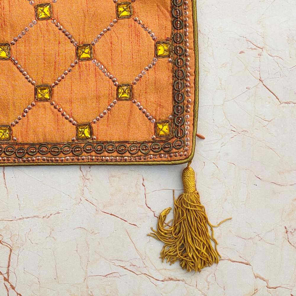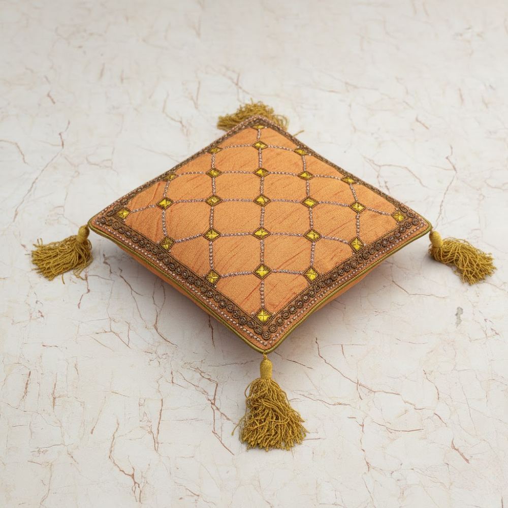 The finely handcrafted quilting adds depth and texture, while matching orange tassels on all four corners lend a graceful decorative finish. Its compact 12"x12" size makes it ideal for styling sofas, accent chairs, beds, or decorative corners, adding color and character to any space.