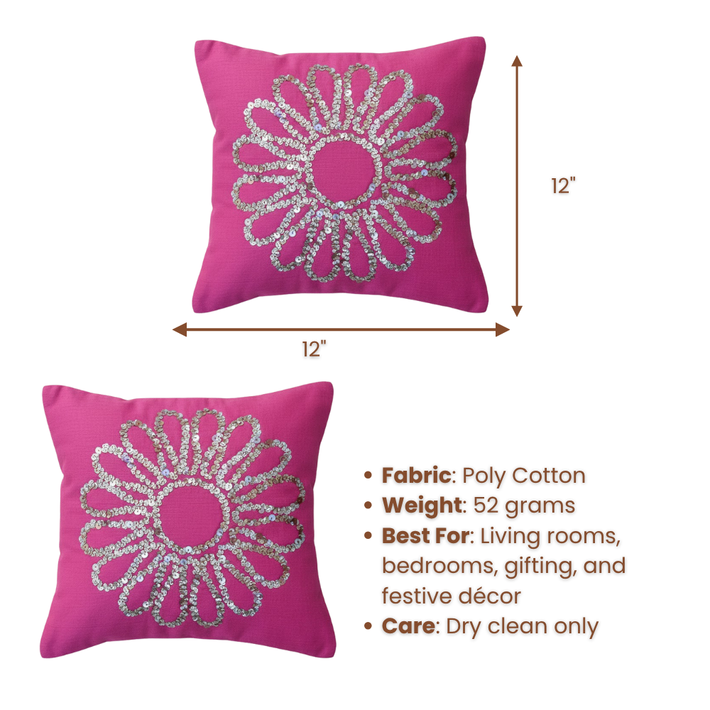 The soothing pink shade adds a fresh and lively vibe, making it perfect for living rooms, bedrooms, nurseries, and cozy reading corners. Lightweight at 52 grams and sized 12"x12", it offers a premium yet airy feel, ideal for layering with other cushions or using as a subtle statement piece. To preserve its handcrafted detailing and vibrant color, dry clean only is recommended.