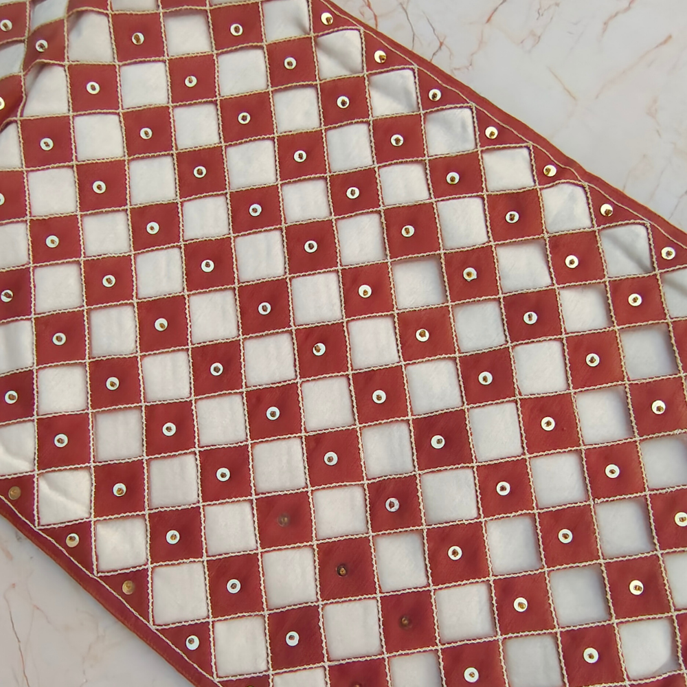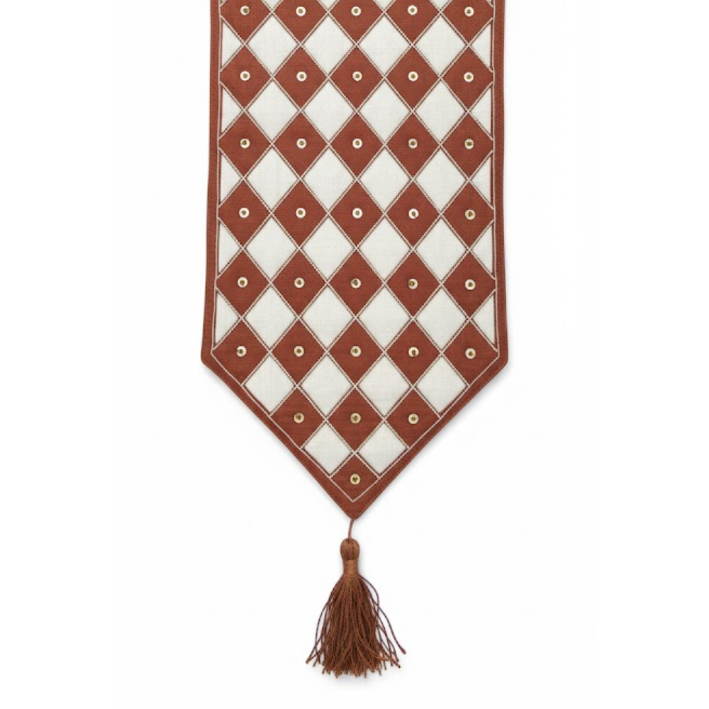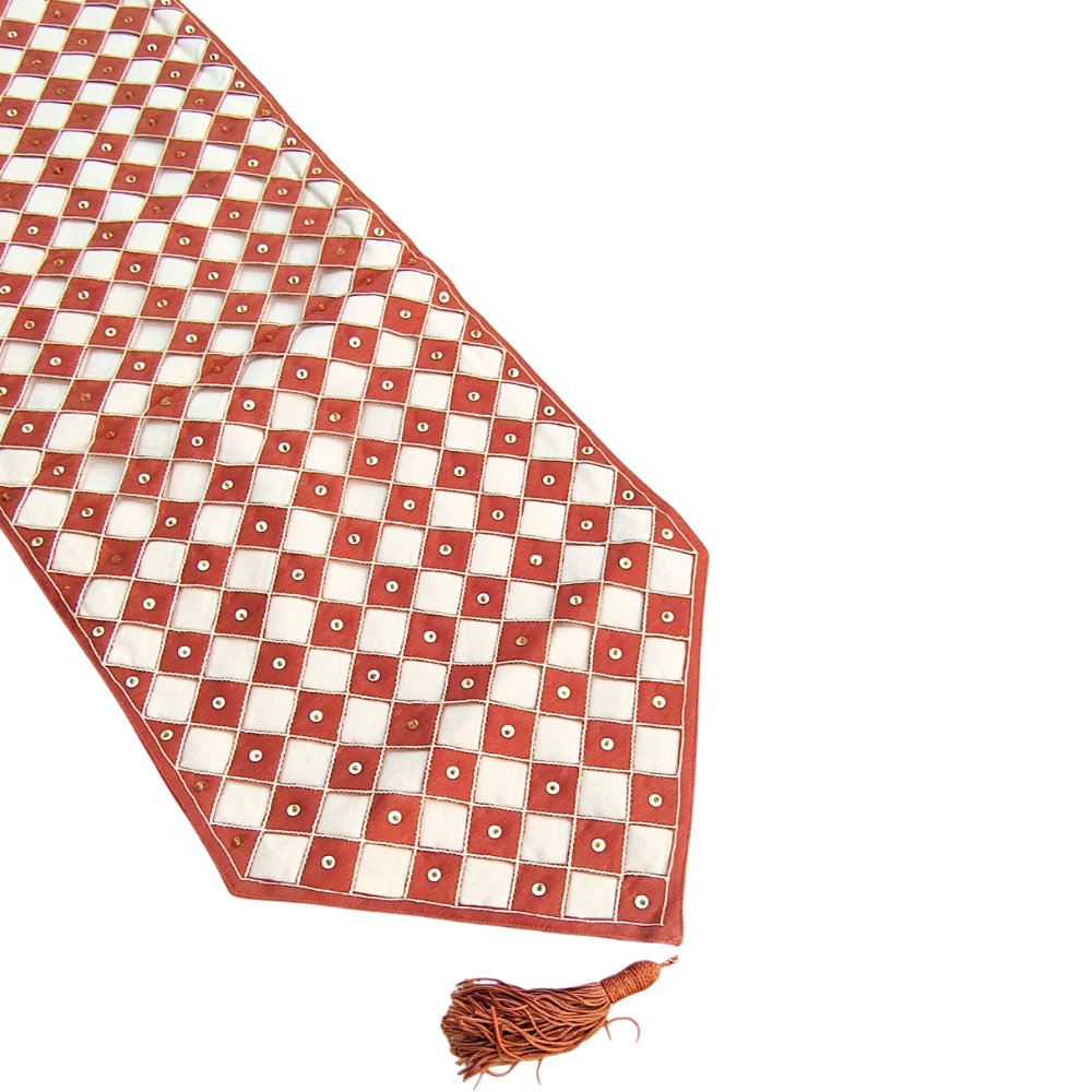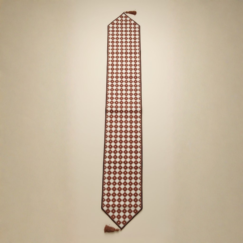 The charming color combination of red and cream brings warmth and sophistication to your table décor, making it perfect for family dinners, celebrations, or stylish everyday use. Designed in a 12"x70" size and weighing 270 grams, it provides a luxurious drape and a premium handcrafted feel. The delicate tassel detail at the ends adds a graceful finishing touch. To maintain its color and quality, dry clean only is recommended.