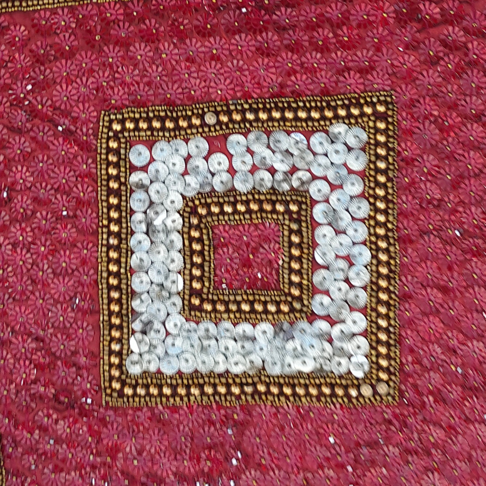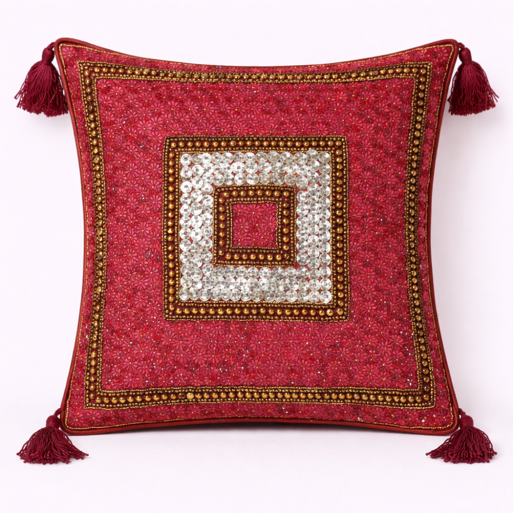 Add a bold statement of elegance and festive charm to your home décor with this handcrafted red cushion cover, beautifully adorned with a striking square embellished design. The rich red base is enhanced with intricate all-over detailing and a layered square motif at the center, highlighted with shimmering accents that create a luxurious focal point.