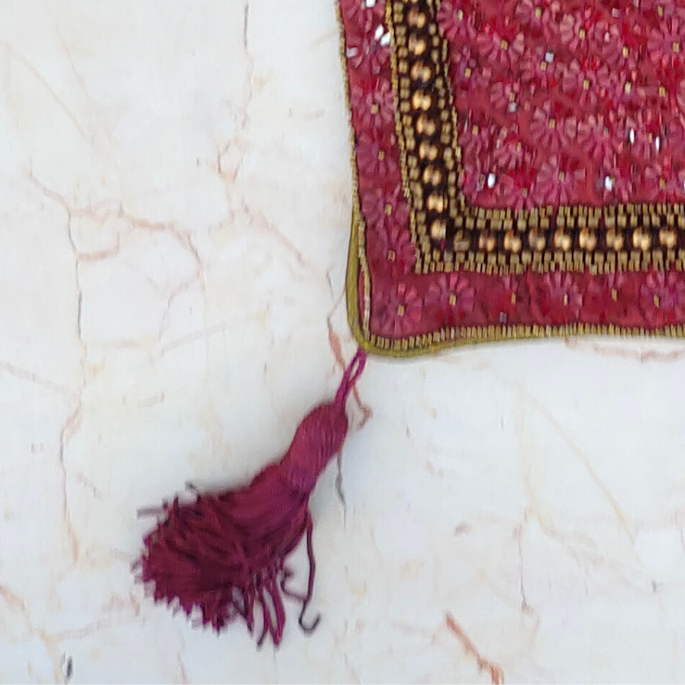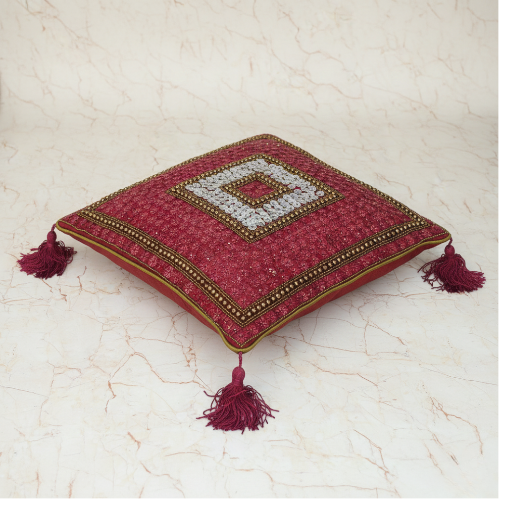 The structured square pattern adds depth and texture, while the tassels on all four corners bring a classic handcrafted touch. Its vibrant yet refined appeal makes it an ideal accent for sofas, beds, lounge seating, or decorative corners—perfectly suited for festive, traditional, and statement interiors.