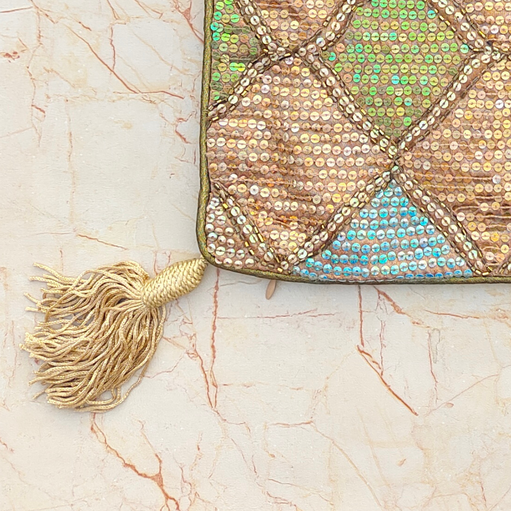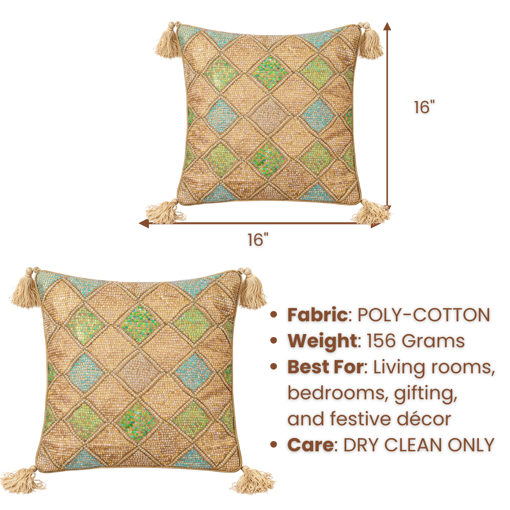 Bring earthy luxury and artisanal charm to your interiors with this exquisitely handcrafted rust cushion cover. Featuring an intricate diamond patchwork design highlighted with subtle multicolor accents in turquoise and green, this cushion cover creates a warm, festive, and visually rich statement.