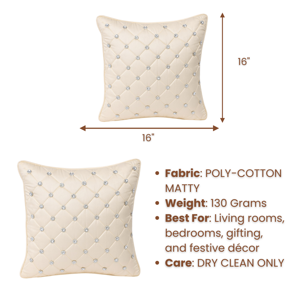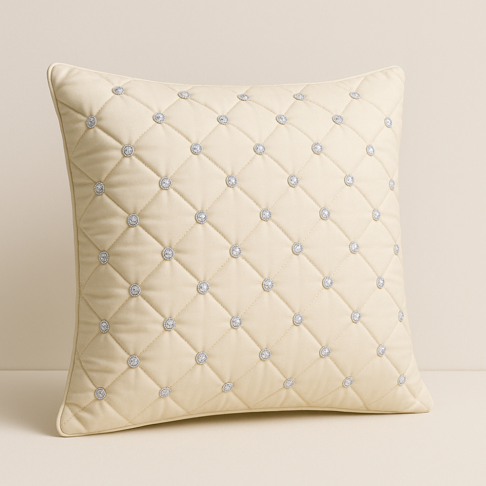 Elevate your living space with the timeless charm of this handcrafted tan cushion cover. The soft tan shade adds warmth and natural elegance, creating a soothing yet luxurious feel that complements modern, earthy, and contemporary interiors beautifully. The refined diamond-quilted pattern, accented with delicate crystal studs, brings a subtle sparkle and sophisticated texture to the design.