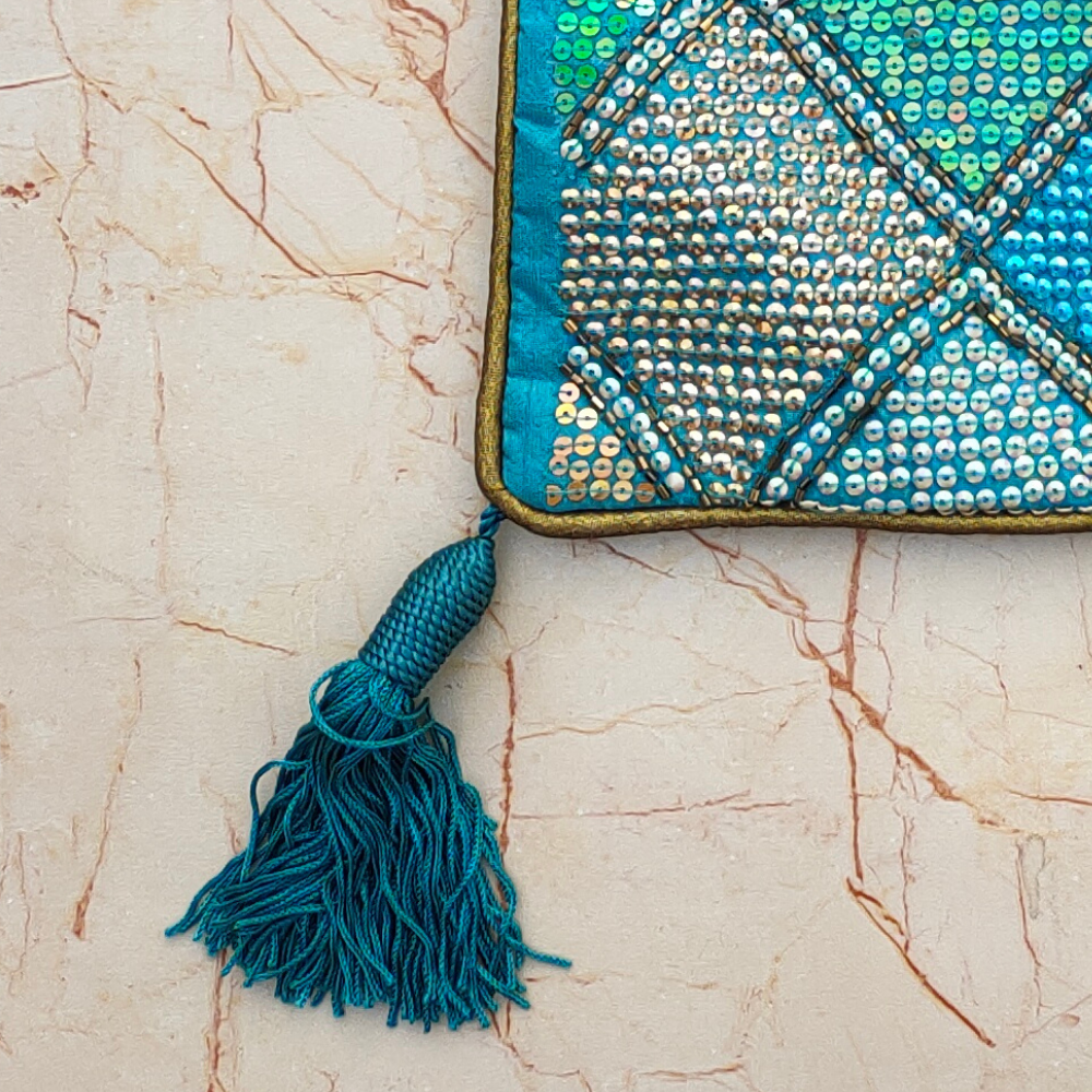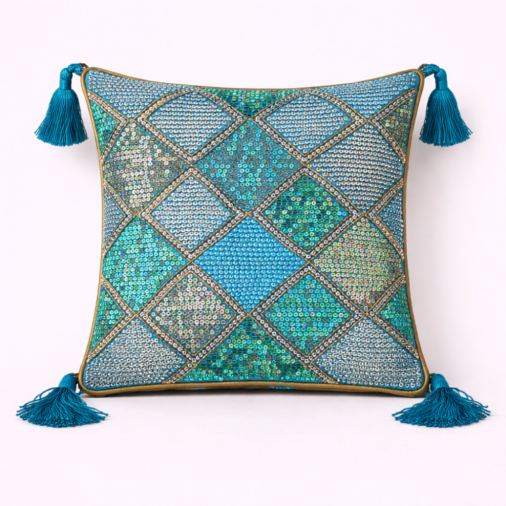 Refresh your living space with the serene elegance of this handcrafted turquoise cushion cover, beautifully detailed with intricate diamond patchwork embroidery. The calming turquoise base is enriched with subtle multicolor accents in green, blue, and earthy tones—creating a sophisticated yet refreshing look that blends effortlessly with both contemporary and traditional interiors.