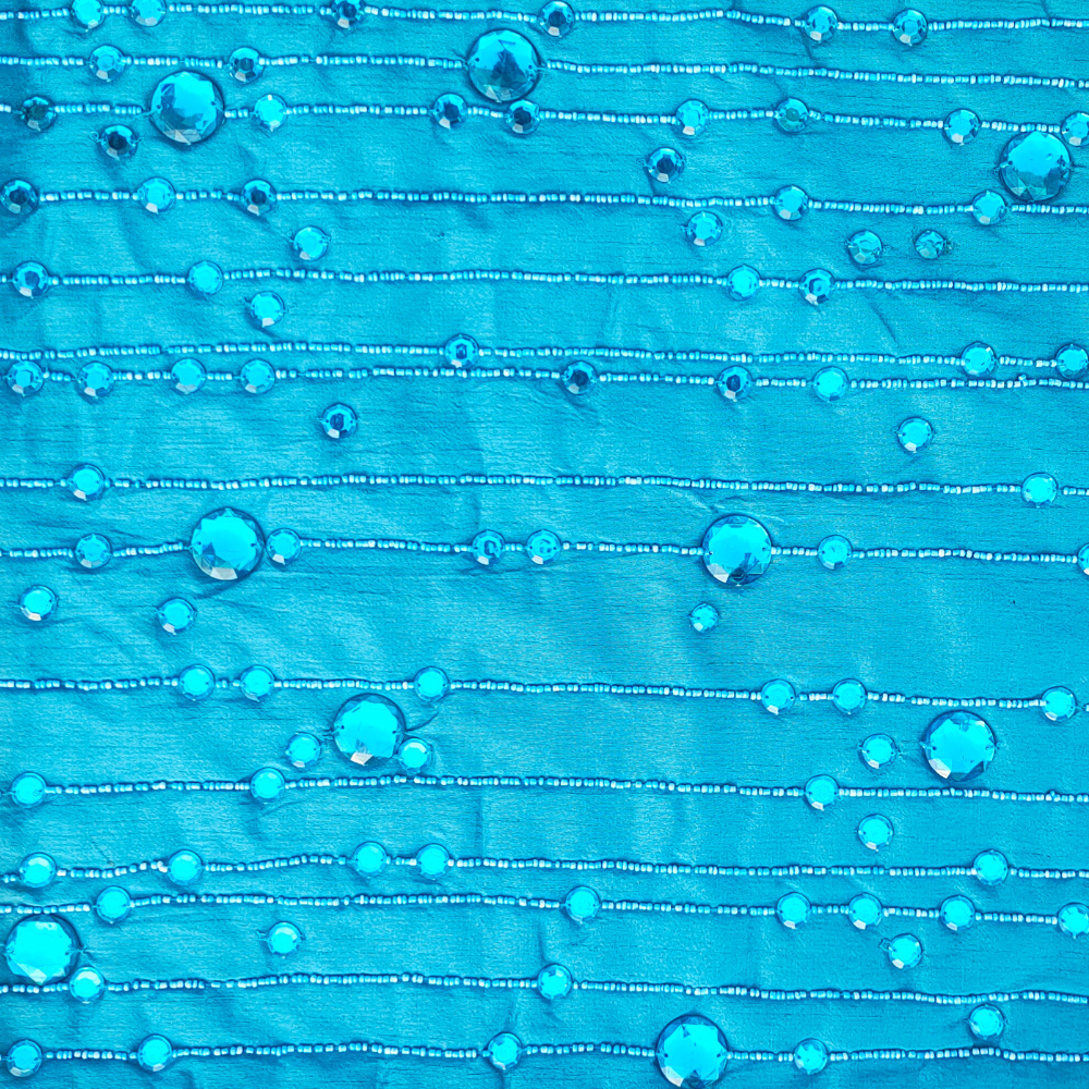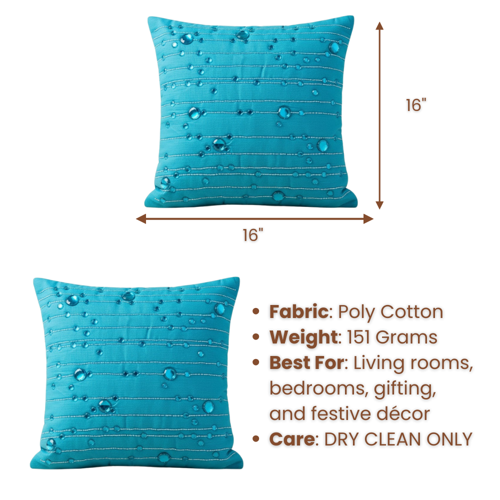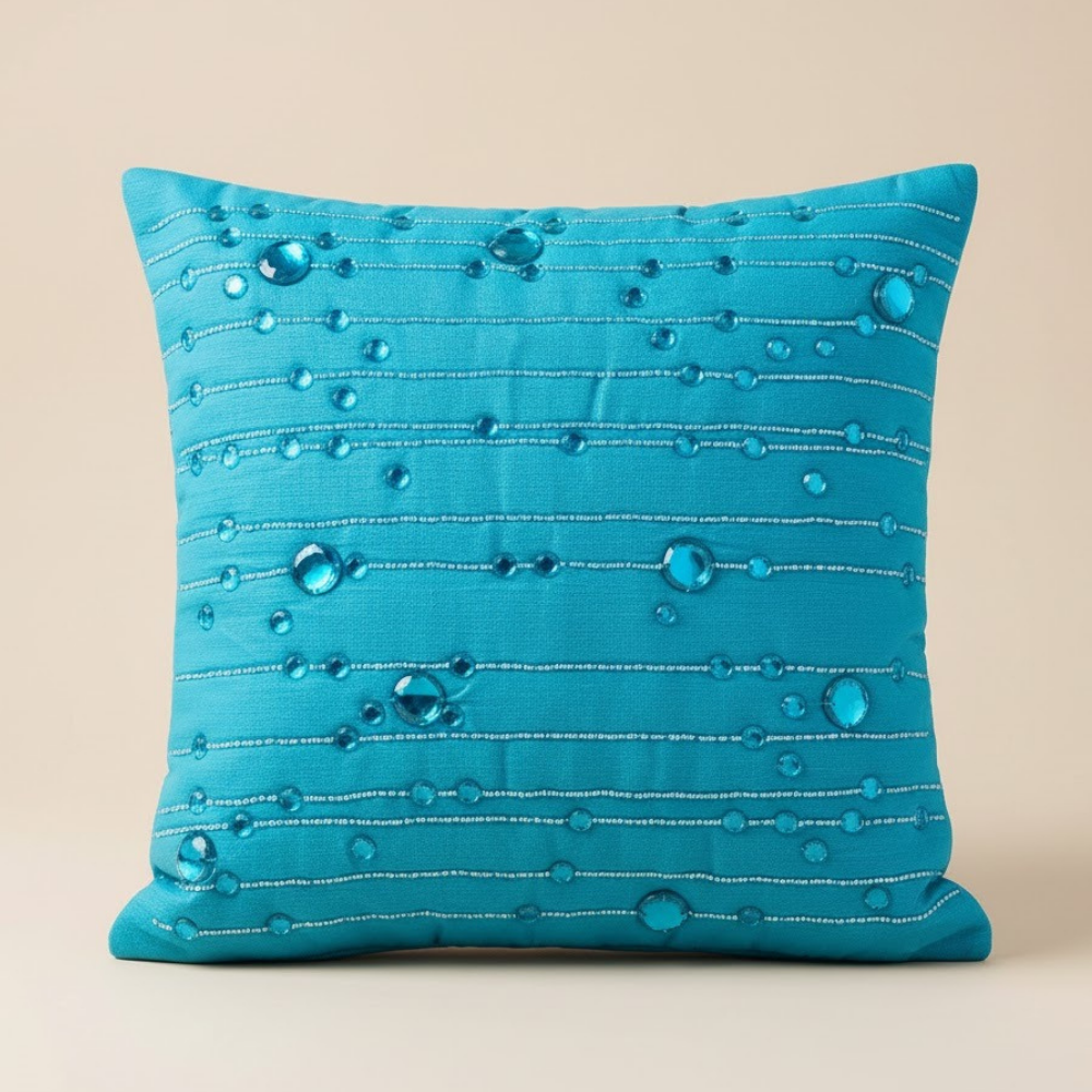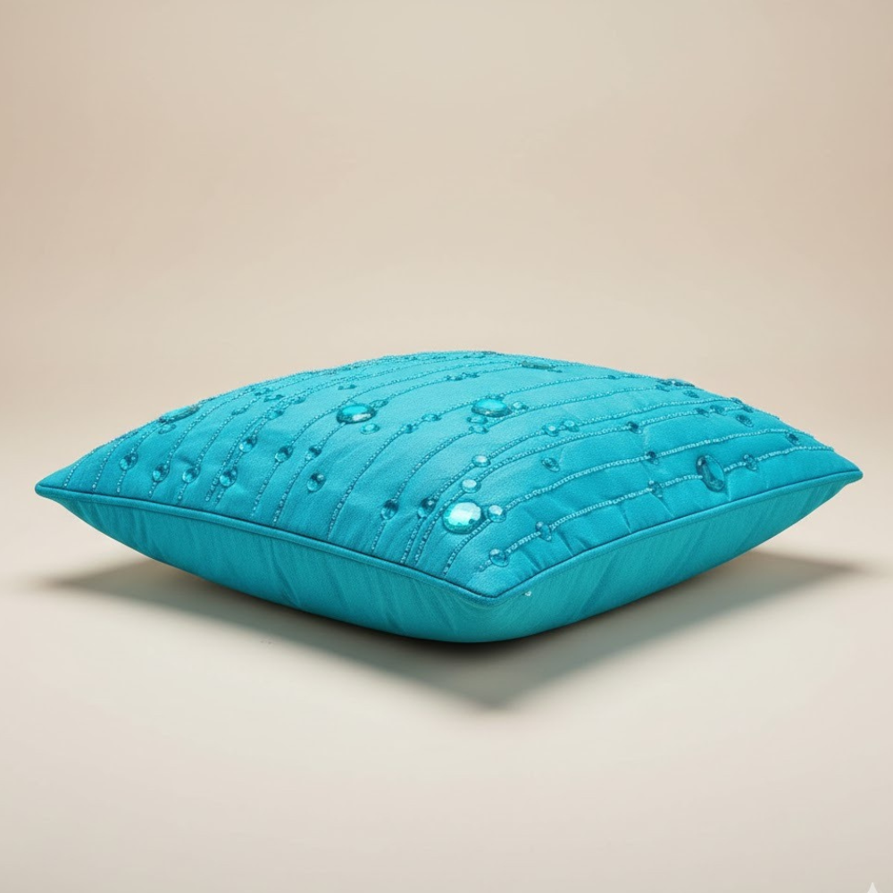 Elevate your décor with this stunning handcrafted turquoise cushion cover, designed to bring a refreshing pop of color and artisanal charm to any space. The rich turquoise shade pairs beautifully with the intricate bead embellishments and vertical thread detailing, creating a luxurious and eye-catching design perfect for both modern and festive interiors.