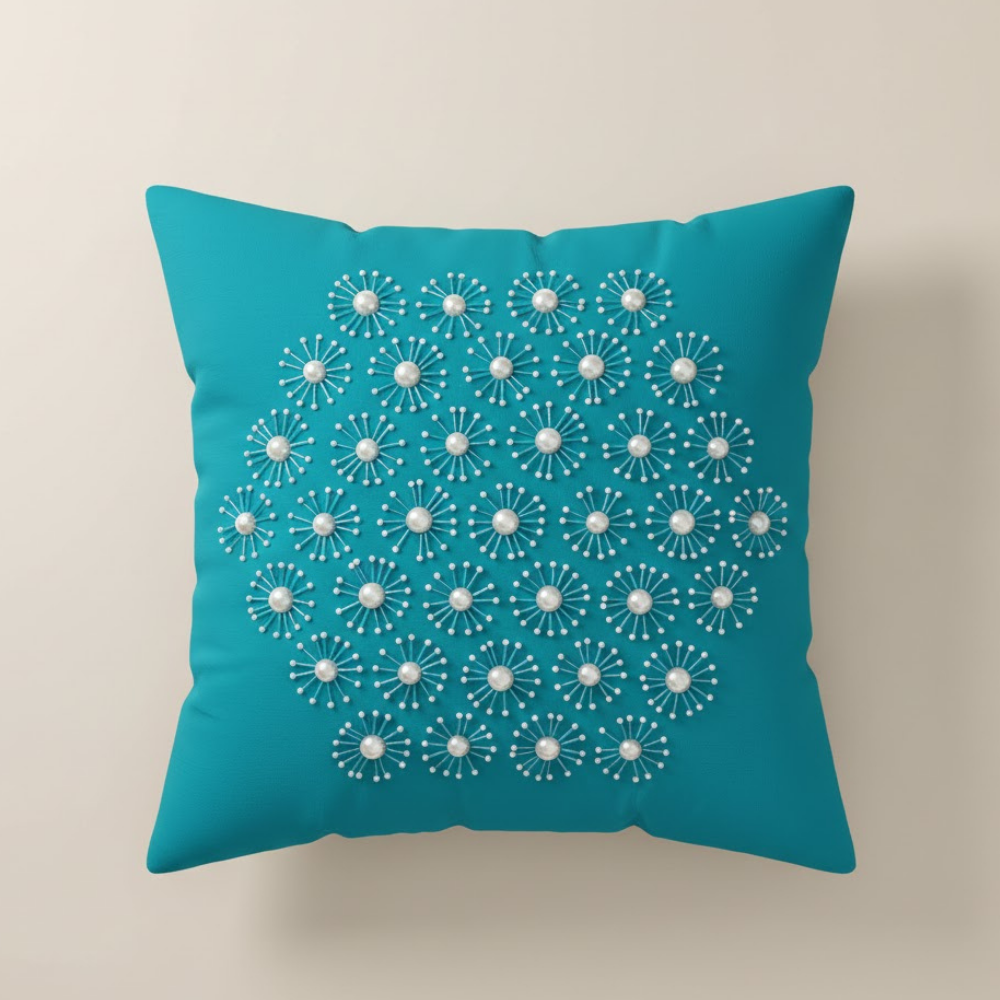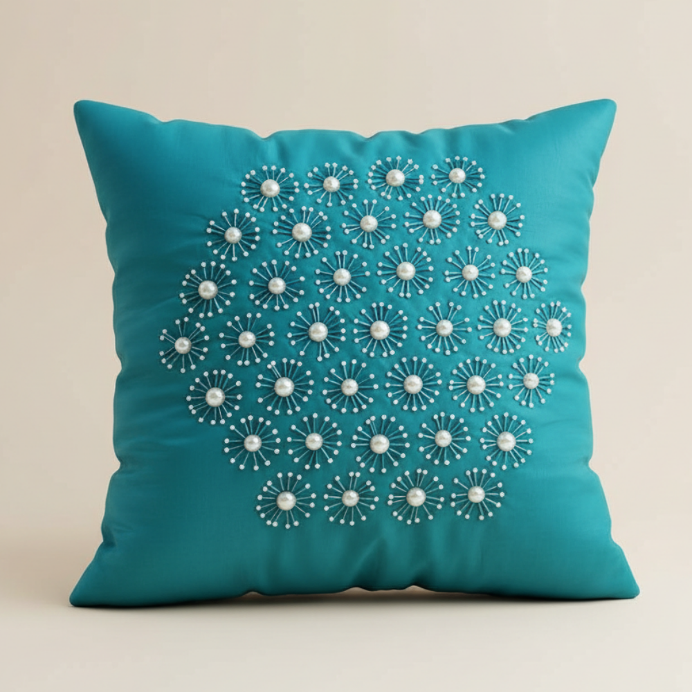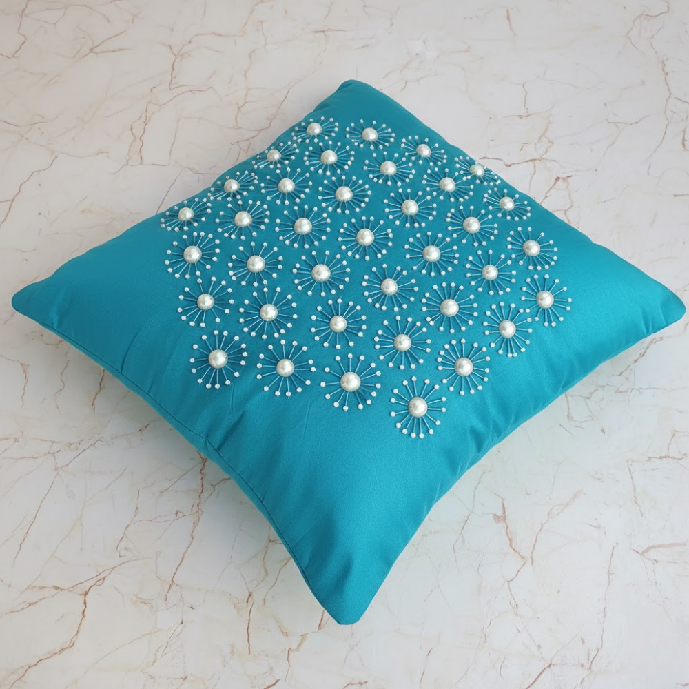 Refresh your space with this handcrafted turquoise cushion cover, designed to add a lively yet sophisticated pop of color to your décor. The rich turquoise base is embellished with a clustered arrangement of delicate 3D floral motifs and bead-style centers, creating a striking textured look that stands out beautifully on sofas, beds, and accent chairs.