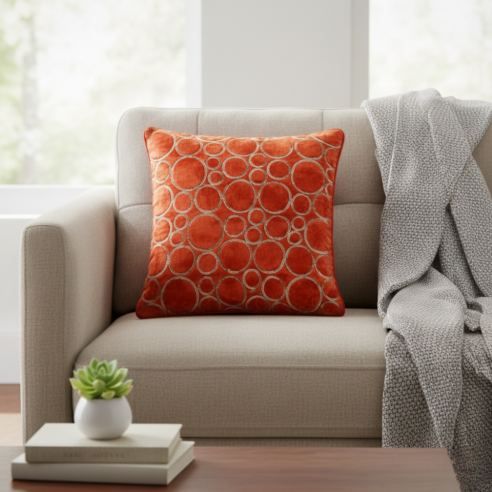 The lively orange tone makes it a standout accent for sofas, beds, lounge seating, and festive arrangements. Its compact 12"x12" size is ideal for layering with neutral or contrasting cushions to create a balanced, designer-inspired setup.