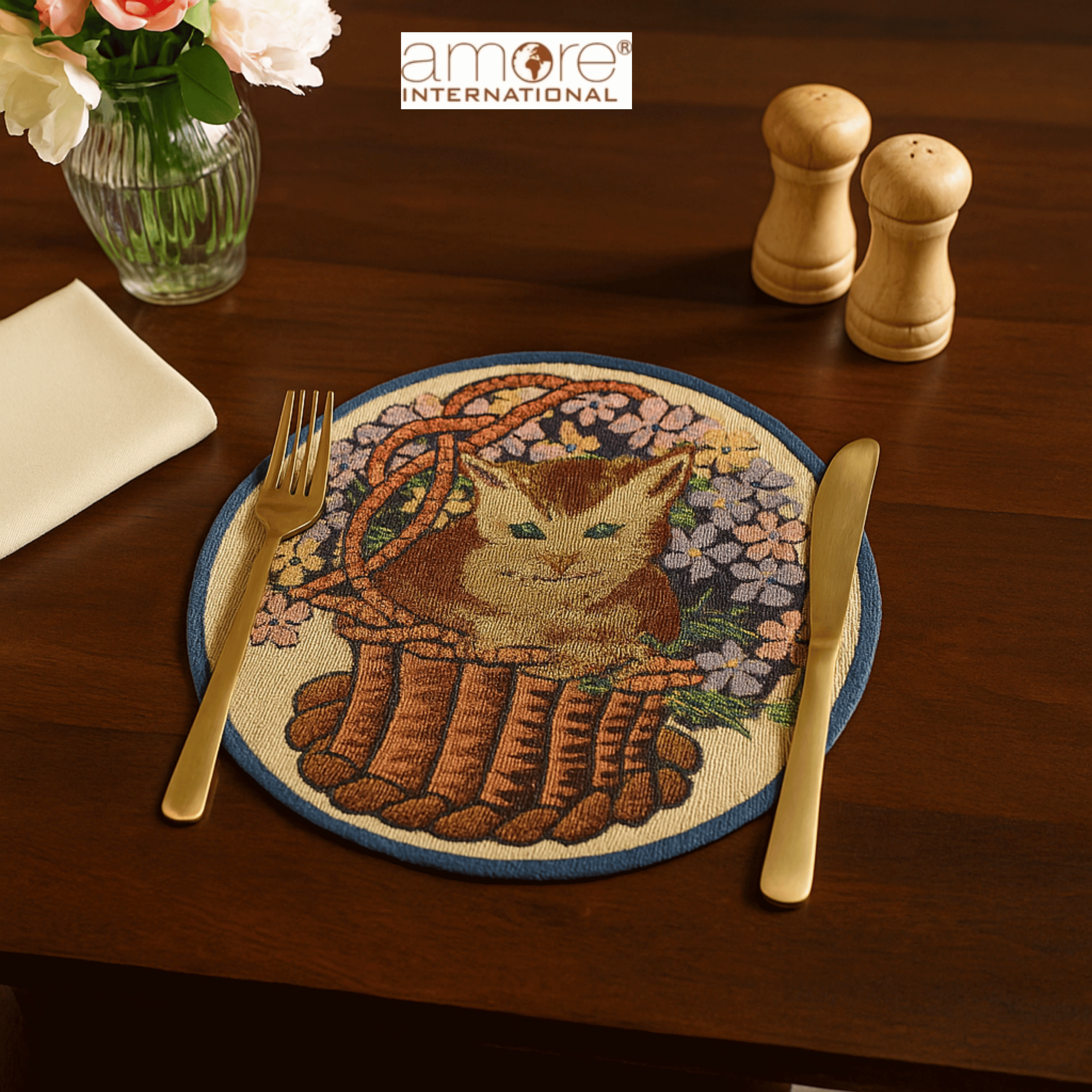 Enhance your dining table with this elegant tapestry doily, designed to bring charm and durability together. Made from premium jacquard woven fabric, it features a delightful kitten-in-basket design surrounded by floral accents, finished with a subtle brown tone and blue edging. The 12"x12" size makes it versatile for placing under plates, vases, or table décor. Weighing just 40 grams, it’s lightweight yet strong enough for daily use. Its intricate weave ensures long-lasting quality, while the soft fabric adds style and warmth to any dining setup. A perfect pick for everyday meals, festive gatherings, or gifting.